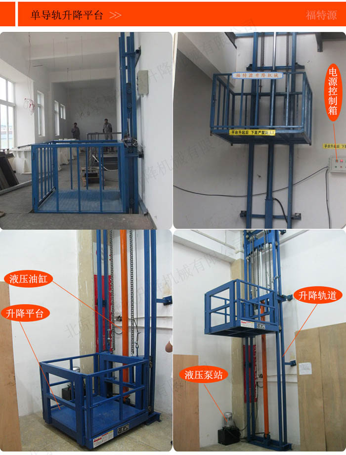 導軌式升降機是一種非剪叉式液壓升降機械設備·用于二三層工業廠房,餐廳,酒樓樓層間的貨物傳輸·高度在150-300mm,尤其適合不能開挖地坑的工作場所·并且無須上部吊點形式多樣化(單柱,雙柱,四柱).設備運行平穩,導軌式升降機的導軌一般為槽鋼、工字鋼,方管焊接制成,操作簡單可靠,貨物傳輸經濟便捷。