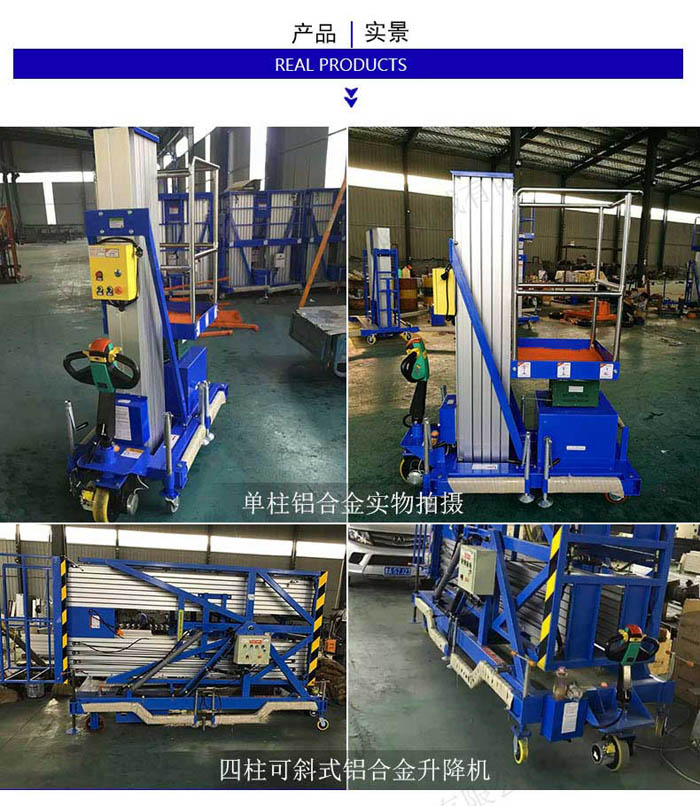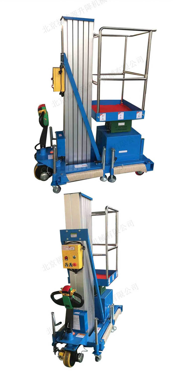 鋁合金式升降機是一種升降機,采用高強度優質鋁合金材料,具有造型美觀、體積小、重量輕、運轉靈活,推行方便。升降平穩、安全可靠等優點。它輕盈的外觀,能在極小的空間內發揮高的舉升能力。廣泛用于工廠、賓館、餐廳、車站、影劇院、展覽館等場所,是保養機具、油漆裝修、調換燈具、電器、清潔保養等用途的安全伴侶。