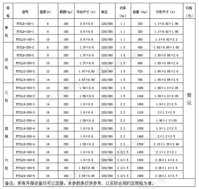 輔助鋁合金單柱升降機常規參數 / Product Parameter